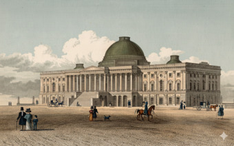 Die Abbildung zeigt das Capitol in Washington in einer historischen Ansicht. Das Bild stammt aus Band 1 von „Meyer's Universum oder Abbildung und Beschreibung des Sehenswerthesten und Merkwürdigsten der Natur und Kunst auf der ganzen Erde“, erschienen 1833. Das Digitalisat ist bei der Universitäts- und Landesbibliothek Düsseldorf unter https://nbn-resolving.org/urn:nbn:de:hbz:061:1-621229 abrufbar. Das Gesamtwerk wurde unter Public Domain Mark 1.0 Universell lizenziert, ist somit gemeinfrei und kann frei verwendet werden. Diese Bildvariante wurde mittels KI (Gemini) nachbearbeitet und coloriert.