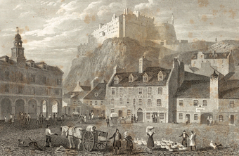 Die Abbildung zeigt Edinburgh Castle vom Grassmarket aus gesehen in einer historischen Ansicht. Das Bild stammt aus Band 1 von „Meyer's Universum oder Abbildung und Beschreibung des Sehenswerthesten und Merkwürdigsten der Natur und Kunst auf der ganzen Erde“, erschienen 1833. Das Digitalisat ist bei der Universitäts- und Landesbibliothek Düsseldorf unter https://nbn-resolving.org/urn:nbn:de:hbz:061:1-621229 abrufbar. Das Gesamtwerk wurde unter Public Domain Mark 1.0 Universell lizenziert, ist somit gemeinfrei und kann frei verwendet werden.