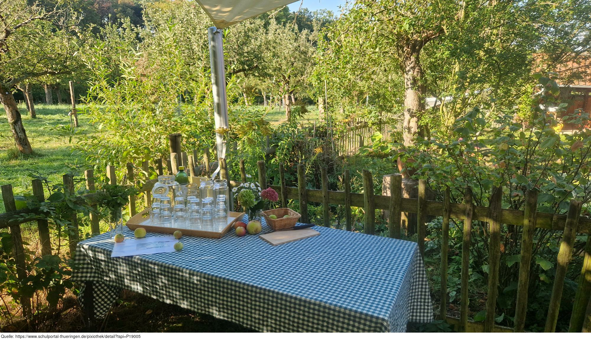 Das Bild zeigt eine Ansicht auf dem ApfelGut Erfurt. Auf einem Tisch mit einer blau-weiß karierten Tischdecke stehen Gläser, Karaffen und Äpfel bereit. Im Hintergrund befindet sich ein Holzzaun, der das Areal begrenzt. Es gelten die Nutzungsbedingungen der Mediothek und Pixiothek.