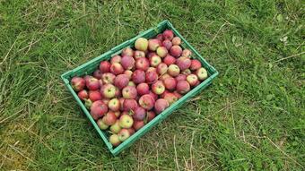 Das Bild zeigt eine Obstkiste mit Äpfeln auf dem ApfelGut Erfurt. Es gelten die Nutzungsbedingungen der Mediothek und Pixiothek.