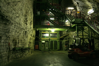 Das Foto gehört zur Serie "Salzbergwerk". Es zeigt einen Fahrstuhl in 500 m Tiefe im Erlebnisbergwerk Merkers. Es gelten die Nutzungsbedingungen der Mediothek und Pixiothek.
