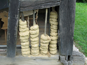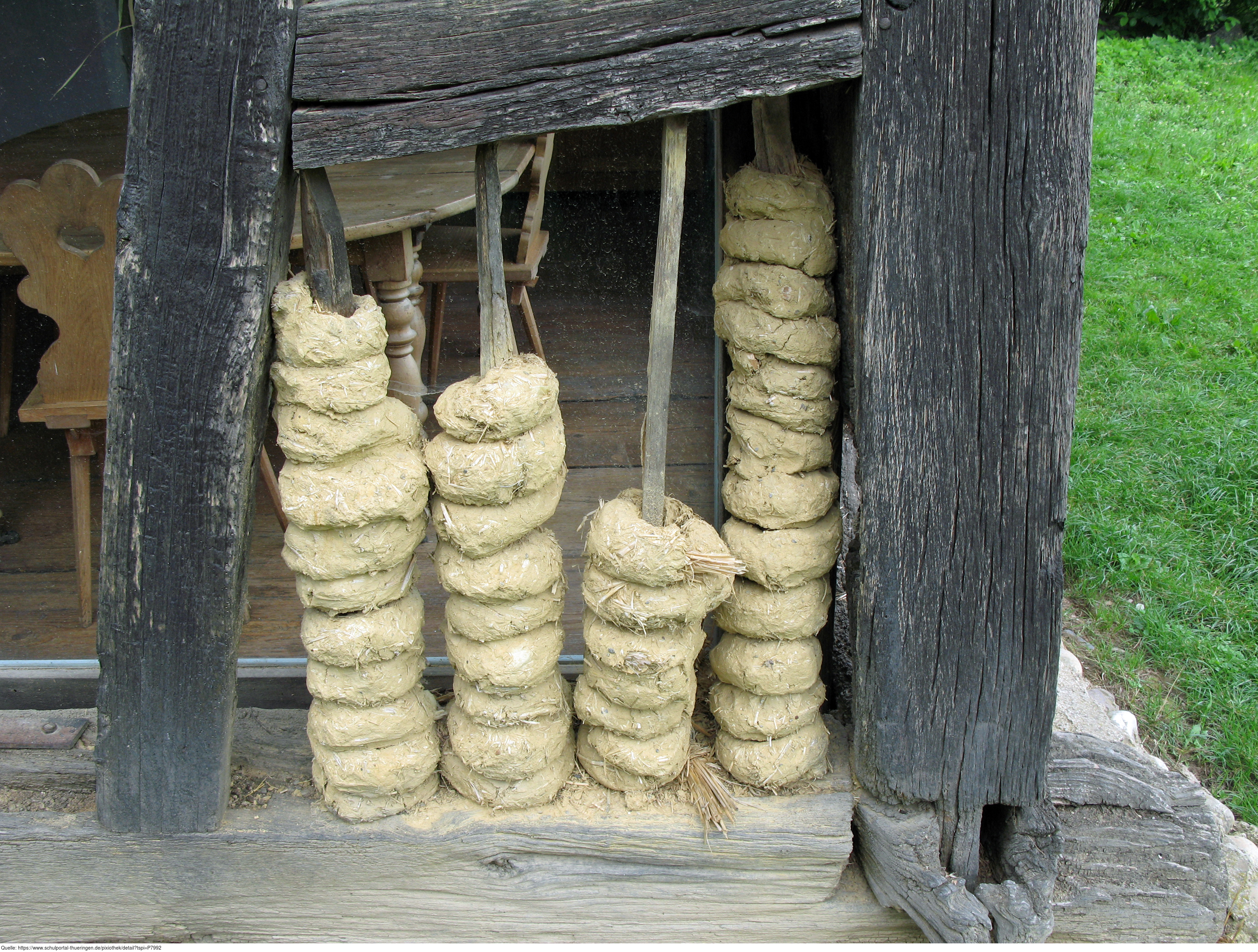 Das Foto gehört zur Serie Fachwerkhäuser. Es zeigt ein Gefach mit Lehmausfachung. Dazu wurden Lehmstaken (längliche Stücke aus gespaltenem Holz) senkrecht in das Gefach eingebaut und diese mit Strohlehm umwickelt. Das Gefach kann dann noch mit Lehm beworfen werden, um eine glatte Oberfläche zu erhalten. Es gelten die Nutzungsbedingungen der Mediothek und Pixiothek.