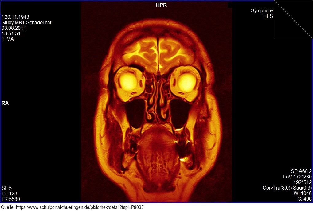 Die Magnetresonanztomographie (MRT) ist ein bildgebendes Verfahren, das vor allem in der medizinischen Diagnostik zur Darstellung von Struktur und Funktion der Gewebe und Organe im Körper eingesetzt wird. Hier zu sehen ist die MRT-Aufnahme des Kopfes eines 68jähigen Mannes. Es gelten die Nutzungsbedingungen der Mediothek und Pixiothek.