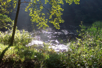 Das Bild gehört zur Serie "Sommerspaziergang". Es zeigt einen kleinen Teich im Wald. Es gelten die Nutzungsbedingungen der Mediothek und Pixiothek.