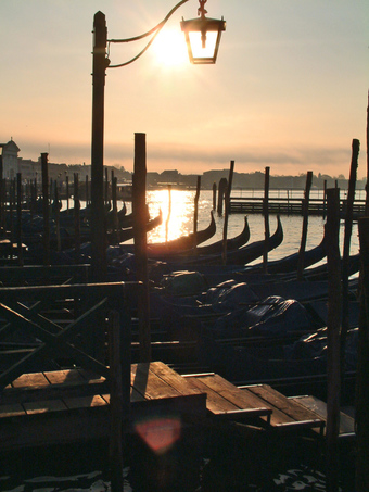 Das Foto gehört zur Serie "Venedig". Es zeigt die Morgenstimmung an der Lagune mit Gondeln und Anlegestelle. Es gelten die Nutzungsbedingungen der Mediothek und Pixiothek.