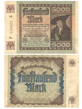 Das Foto gehört zur Serie "Zahlungsmittel in der Weimarer Republik (1918-1933)". Es zeigt eine Reichsbanknote über "Fünftausend Mark" vom 02. Dezember 1922. Es gelten die Nutzungsbedingungen der Mediothek und Pixiothek.