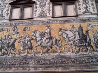 Das Foto gehört zur Serie "Dresdener Fürstenzug". Es zeigt den Abschnitt 1127 bis 1195 - Konrad der Große, Otto der Reiche, Albrecht der Stolze. Der Fürstenzug in Dresden ist das Bild eines Reiterzuges, aufgetragen auf rund 23.000 Fliesen aus Meißner Porzellan auf der Außenwand des Stallhofs in der Augustusstraße. Das 102 Meter lange Kunstwerk stellt die Ahnengalerie der zwischen 1127 und 1873 in Sachsen herrschenden Markgrafen, Herzöge, Kurfürsten und Könige aus dem Geschlecht des Fürstenhauses Wettin dar. Es gelten die Nutzungsbedingungen der Mediothek und Pixiothek.