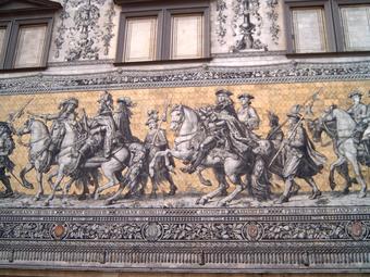 Das Foto gehört zur Serie "Dresdener Fürstenzug". Es zeigt den Abschnitt 1680 bis 1763 - Johann Georg III., Johann Georg IV., August II., August III. Der Fürstenzug in Dresden ist das Bild eines Reiterzuges, aufgetragen auf rund 23.000 Fliesen aus Meißner Porzellan auf der Außenwand des Stallhofs in der Augustusstraße. Das 102 Meter lange Kunstwerk stellt die Ahnengalerie der zwischen 1127 und 1873 in Sachsen herrschenden Markgrafen, Herzöge, Kurfürsten und Könige aus dem Geschlecht des Fürstenhauses Wettin dar. Es gelten die Nutzungsbedingungen der Mediothek und Pixiothek.