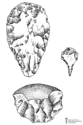 Das Bild gehört zur Serie "Zeichnungen Steinzeit - Museum für Ur- und Frühgeschichte Thüringens". Abgebildet sind verschiedene Steinwerkzeuge. Es gelten die Nutzungsbedingungen der Mediothek und Pixiothek.