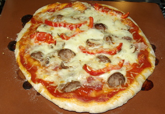 Das Foto gehört zur Serie "Nahrungsmittel". Es zeigt eine Pizza, ein vor dem Backen würzig belegtes Fladenbrot aus einfachem Hefeteig. Das Bild ist unter CC0 lizenziert und kann somit frei verwendet werden.