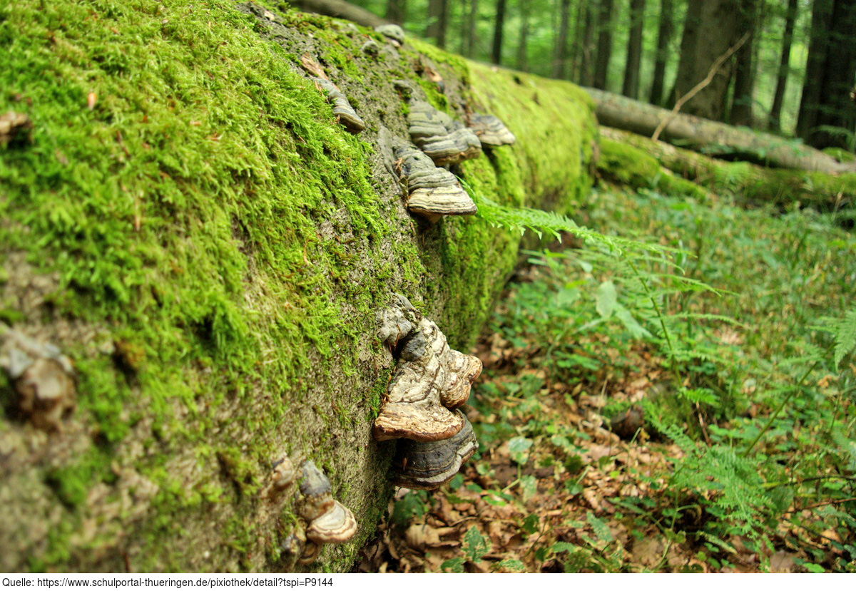 Das Foto gehört zur Serie "Laubbäume". Es zeigt einen liegenden abgestorbenen Baum (Totholz) mit Baumpilzen. Das Bild ist unter CC0 lizenziert und kann somit frei verwendet werden.