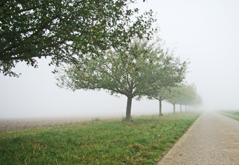 Straße mit Apfelbäumen im Nebel