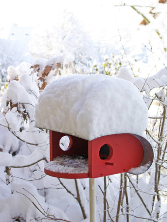 Das Foto gehört zur Serie "Vögel im Winter". Es zeigt ein Vogelhäuschen, eine überdachte Futterstellen für frei lebende Vögel, die mit Vogelfutter bestückt wird. Es gelten die Nutzungsbedingungen der Mediothek und Pixiothek.